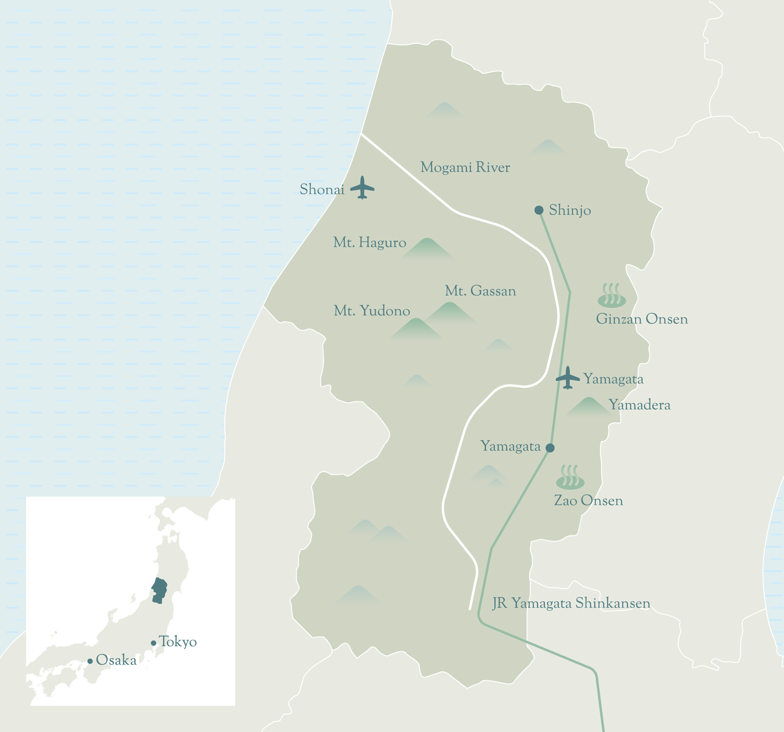 Yamagata Prefecture is located in Northern Japan, bordered by the Sea of Japan to the west and the Ou Mountain Range to the east.